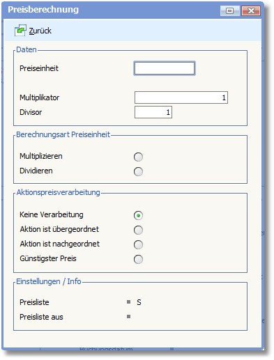 Aus einer Dropdownliste können Sie übliche Preiseinheiten auswählen. Es ist aber jede ganze Zahl erlaubt.