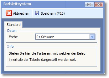 Über den Menüeintrag "Bearbeiten > Optionen/Parameter > Farbleitsystem" in der Positionserfassung können Sie festlegen, mit welcher Schriftfarbe der Beleg in der Belegübersicht dargestellt wird.