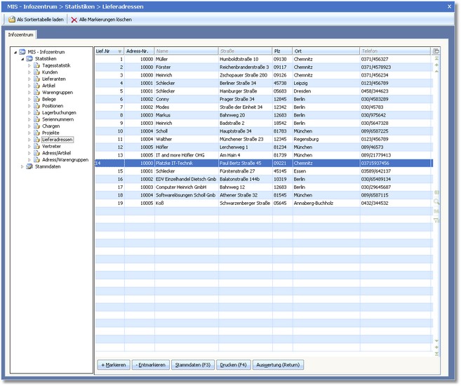 Nach Auswahl dieses MIS-Bereiches öffnet sich eine Auswahltabelle, in der alle Lieferadressen aufgelistet werden. Innerhalb dieser Auswahltabelle sind die bereits beschriebenen Such- und Sortierfunktionen aktiv.