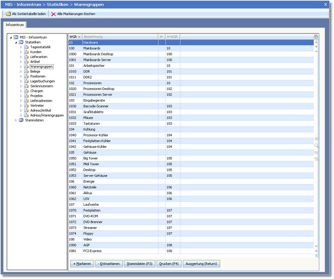 Nach Auswahl dieses Statistikbereichs öffnet sich die zentrale Warengruppenbearbeitung.