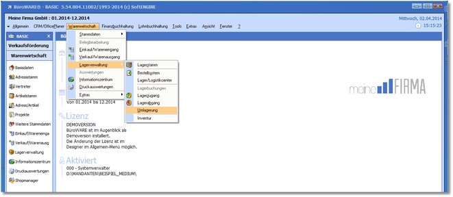 1. Zeigen Sie mit der Maus im Hauptmenü auf "Warenwirtschaft > Lagerverwaltung > Umlagerung".