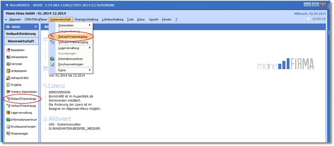1. Verlassen Sie den Bearbeitungsdialog des Bestellvorschlags und wählen Sie im Hauptmenü: „Warenwirtschaft > Einkauf/Wareneingang".