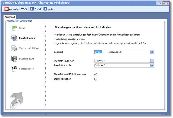 Nachfolgend wird beschrieben, wie bei der Ersteinrichtung des ePages-Marketplaces die Übernahme der Artikeldaten aus dem Shop erfolgt.