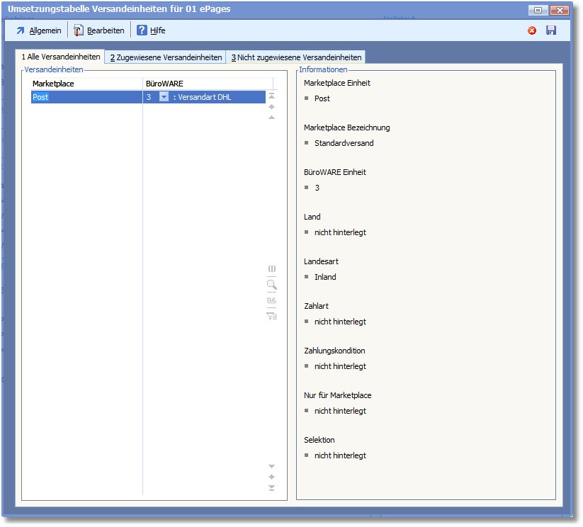<< Hier KLicken um eine Inhaltsübersicht anzuzeigen >> Navigation: Warenwirtschaft > Extras > Shopmanager > Marketplaces > ePages > Marketplace verwalten > Umsetzungstabellen > Versandeinheiten |