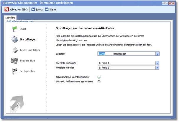 Das Dialogfenster "Übernahme Artikeldaten" wird geöffnet, wo der Lagerort und die gültigen Preislisten festgelegt werden: