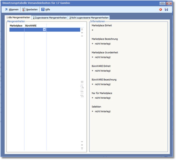 << Hier KLicken um eine Inhaltsübersicht anzuzeigen >> Navigation: Warenwirtschaft > Extras > Shopmanager > Marketplaces > Gambio > Marketplace verwalten > Umsetzungstabellen > Mengeneinheiten |