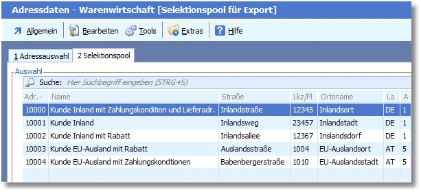 Es soll eine Selektion aufgebaut werden, welche nur Adressen in den Selektionspool holt, die aus Deutschland oder Österreich kommen, in den Adressgruppen 1 "Geschäftskunden" und "Auslandkunden EU" vorhanden sind und kein Lieferant oder Erstkontakt sind, z.B.: