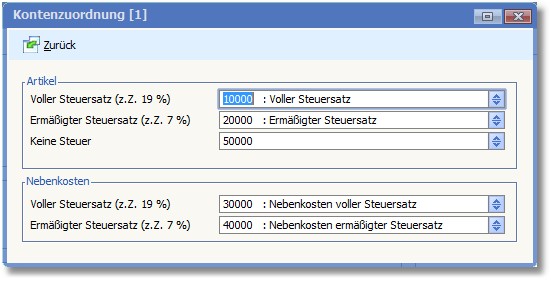 In diesen Feldern sind die Kontenzuordnungen für vollen/ermäßigten/keinen Steuersatz aus der Erstkonfiguration ersichtlich.