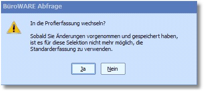 ! Achtung, wird von der Standarderfassung in die Profierfassung gewechselt, kann für diese Selektion nicht mehr zurück in die Standarderfassung gewechselt werden: