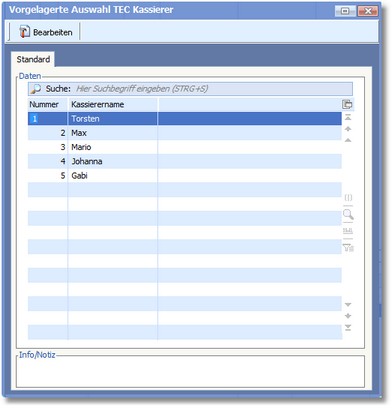 In dieser Auswahltabelle TEC werden Kassierer angelegt, bearbeitet und gelöscht.