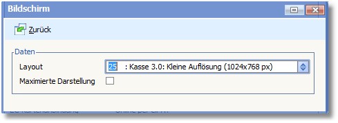 << Hier KLicken um eine Inhaltsübersicht anzuzeigen >> Navigation: Kassensystem > Technische Informationen (Systeminformation) > Vorbereitende Arbeiten > Grundeinrichtung der Kasse > Detaileinrichtung der Kasse (Basisdaten) > Kassenstammdaten > Kassenstammdaten erfassen/ändern > Die Karteikarte "Standard" > Karteikarte "Standard" - Menü > Auflösung/Bildschirm |