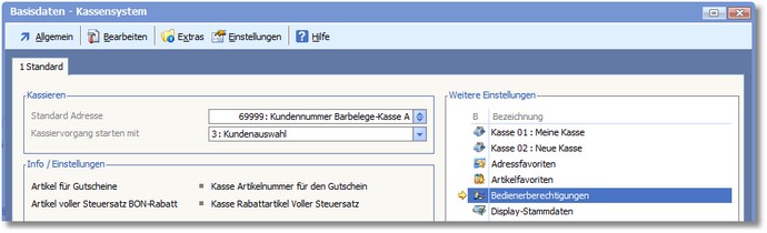 Sie können die Bedienerberechtigungen in den Basisdaten des Kassensystems über den Bereich "Weitere Einstellungen" aufrufen.