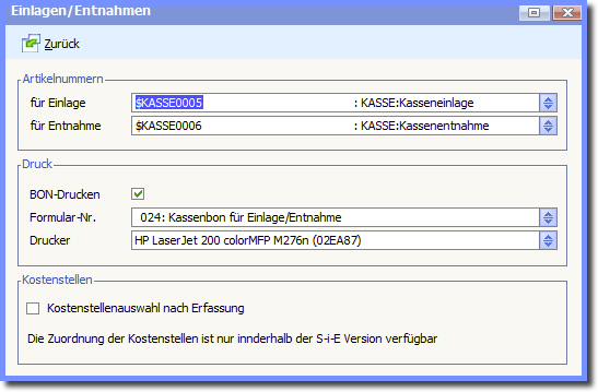 Steuern Sie in diesem Bereich, ob bei einer Einlage bzw. Entnahme ein BON gedruckt werden soll. Hinterlegen Sie hier das entsprechende Formular und den gewünschten Drucker.