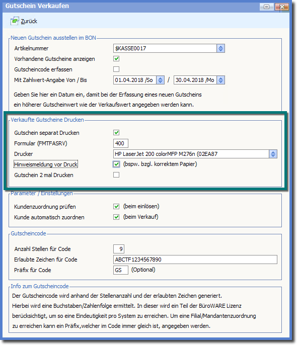 << Hier KLicken um eine Inhaltsübersicht anzuzeigen >> Navigation: Kassensystem > Bedienung der Kasse (Anwenderinformationen) > Spezielle Vorgänge an der Kasse > Gutscheine > Einstellungen zum Gutscheindruck |