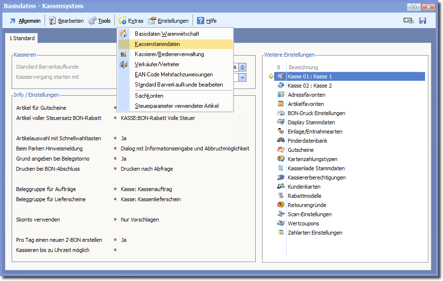 hier können Sie die Kassenstammdaten im Menü "Extras" öffnen.