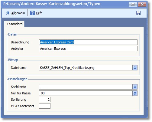 << Hier KLicken um eine Inhaltsübersicht anzuzeigen >> Navigation: Kassensystem > Technische Informationen (Systeminformation) > Vorbereitende Arbeiten > Grundeinrichtung der Kasse > Detaileinrichtung der Kasse (Basisdaten) > Weitere Einstellungen > Kartenzahlungstypen > Kartenzahlungstypen erfassen/ändern |