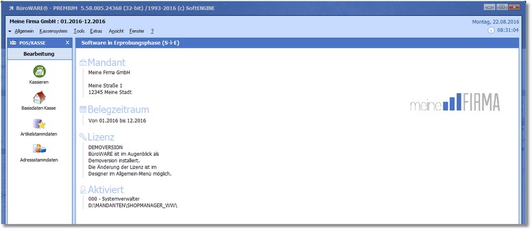 Der Arbeitsbereich zeigt im Hauptbildschirm (Abb.) Informationen über Mandant, Belegzeitraum, Lizenz, aktivem Benutzer sowie das Firmenlogo an. Jeder dieser Bereiche ist per Mausklick aktivierbar, der Cursor verwandelt sich über einem auswählbaren Bereich in eine Hand.