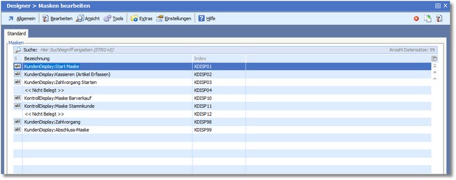 In den Display-Stammdaten öffnet sich über den Menüeintrag "Extras > Masken" eine Auswahl, wo bis zu 99 Masken designt werden können.