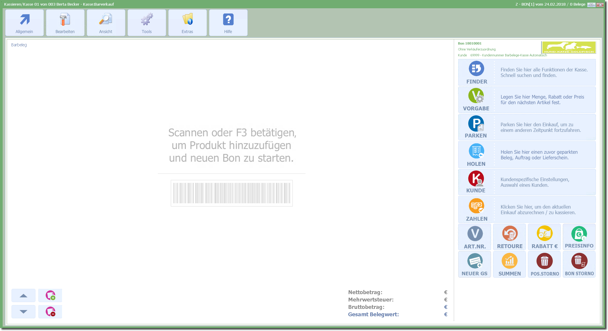 Die Erfassungsmaske für einen neuen BON wird angezeigt und es können Verkaufsvorgänge durchgeführt werden.