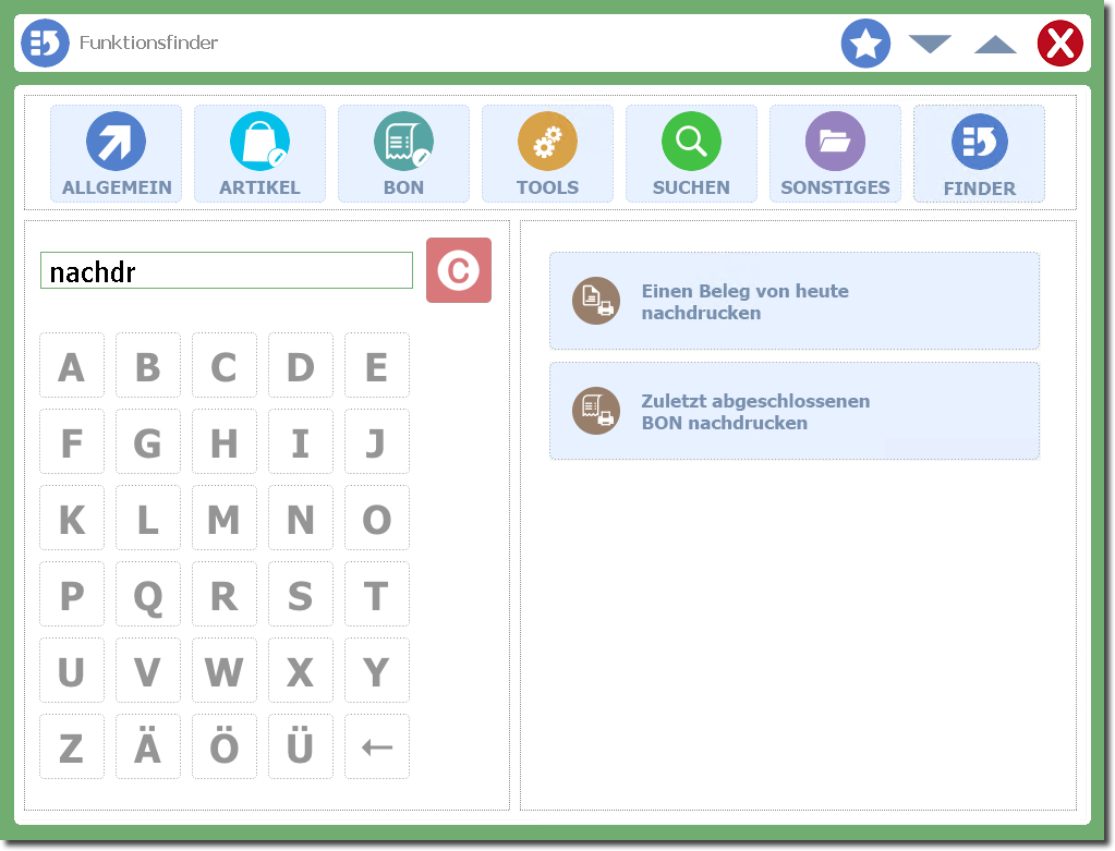 Der "Finder" schlägt passende Funktionen vor, die Sie direkt von dort aus aufrufen können - wie beispielsweise den BON-Nachdruck.