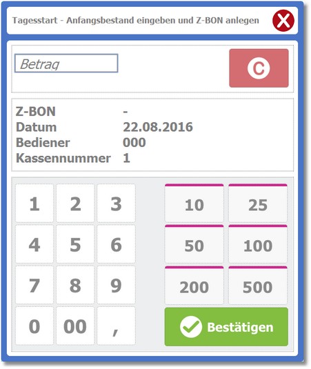 Erfassen Sie die Daten und speichern Sie den Tagesstart mit der Funktionstaste [F9] oder mit dem Symbolbutton "Bestätigen".