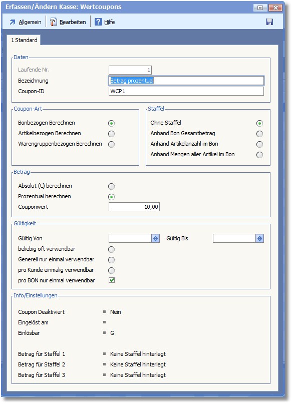 Bei der Erstellung eines Wertcoupons sind folgende Werte festzulegen: