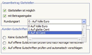 Zusätzlich kann angegeben werden, welche Regeln für eine automatische Rundung des Zahlbetrages angewandt werden sollen.