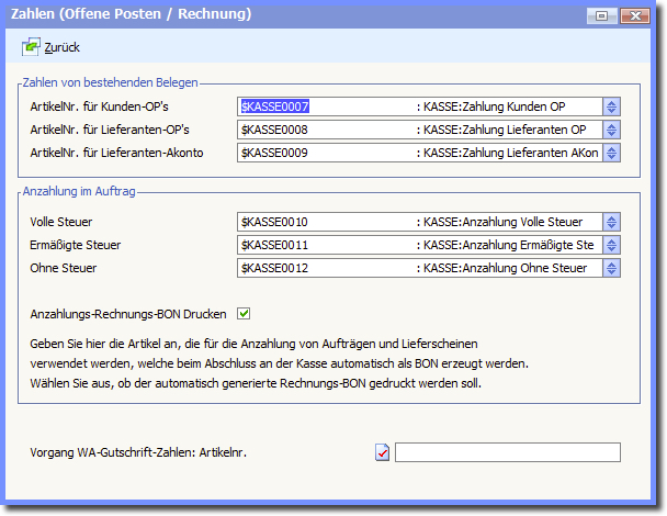 In diesem Bereich müssen Artikel für Vorgänge hinterlegt werden, wenn eine offene Kunden- oder Lieferanten-Rechnung direkt an der Kasse bezahlt werden soll.