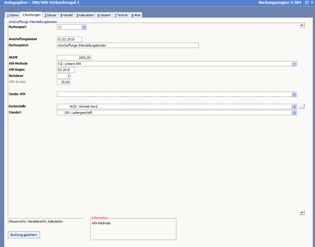 Anschaffungs- oder Herstellungskosten einer Anlage werden mit der Buchungsart 11 eingebucht. Das Programm erstellt daraufhin alle planmäßigen Abschreibungen über die gesamte betriebsgewöhnliche Nutzungsdauer.