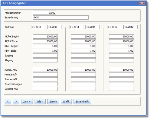 Die Maske zeigt jeweils drei aufeinander folgende Wirtschaftsjahre. Für jedes eingeblendete Wirtschaftsjahr werden die errechneten Anlagewerte angezeigt. Über den Button <Jahr+> wird die Anzeige um ein Wirtschaftsjahr nach vorne verschoben, der Button <Jahr-> verschiebt die Anzeige wieder um ein Wirtschaftsjahr zurück.