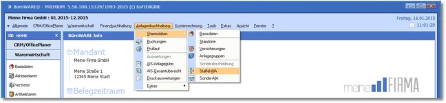 1. Klicken Sie mit der Maus im Hauptmenü auf "Anlagenbuchhaltung > Stammdaten > Staffel-AFA".