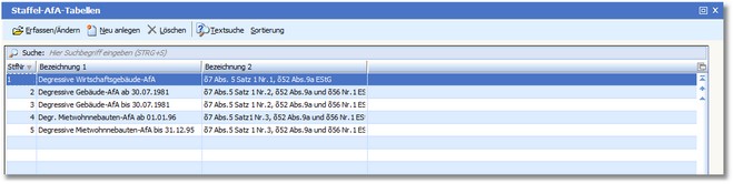 Das Programm öffnet zuerst eine vorgelagerte Auswahl, in der die bereits erfassten Staffel-AfA-Arten tabellarisch angezeigt werden.