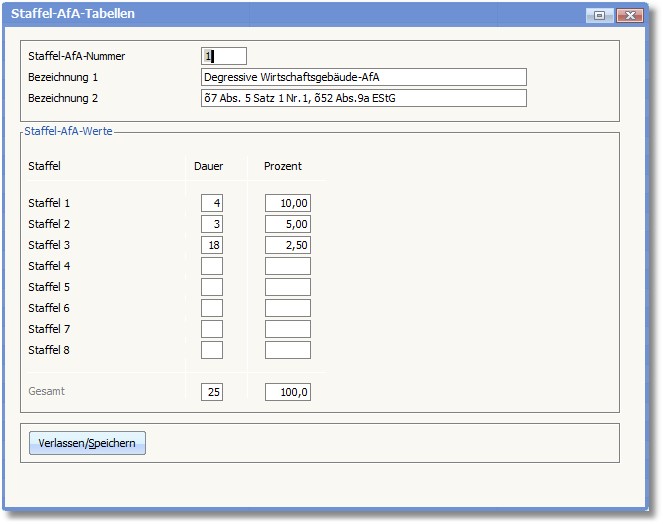 Bevor jedoch diese Zuordnung geschehen kann, müssen Sie die entsprechenden Staffel-Abschreibungen anlegen. Für die steuerrechtliche degressive Gebäudeabschreibung kommen zum Beispiel die folgenden Staffel-Abschreibungen in Betracht: