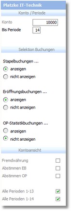 4. Im Bereich"Selektion Buchungen" können Sie festlegen, ob Stapelbuchungen, Eröffungsbuchungen und/oder die OP-Statistikbuchungen angezeigt werden sollen.