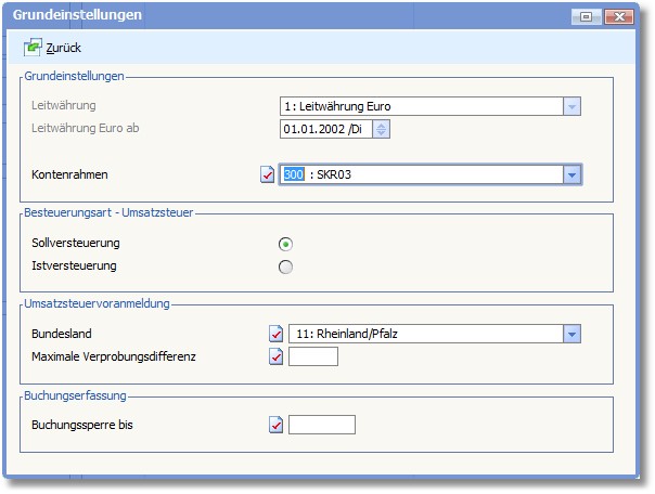 Über den Menüpunkt "Bearbeiten > Grundeinstellungen" in den Basisdaten hinterlegen Sie grundlegende Parameter für die Finanzbuchhaltung:
