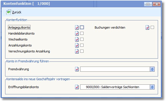 Über den Menüeintrag "Bearbeiten > Optionen/Parameter > Kontenfunktion" werden die Kontenfunktionen des Sachkontos bearbeitet:
