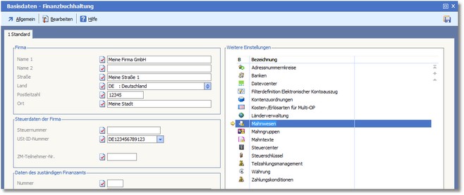 In den Basisdaten können grundlegende Eigenschaften für das Mahnwesen festgelegt werden.