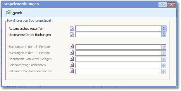 Über den Menüeintrag "Bearbeiten > Stapelzuordnungen" in den Basisdaten werden Buchungsstapel für verschiedene Buchungsvorgänge zugewiesen: