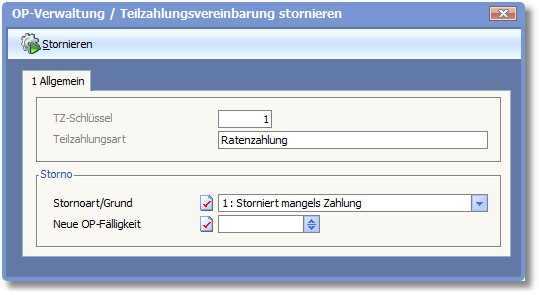Das Programm öffnet den Dialog „OP-Verwaltung / Teilzahlungsvereinbarung stornieren".
