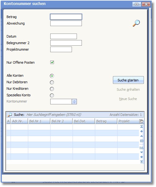 Über Radiobuttons können Sie zusätzlich festlegen, wo gesucht werden soll. Auf allen Konten, nur Debitoren, nur Kreditoren oder auf einem speziellen Personenkonto, das Sie im Feld KONTONUMMER angeben können.