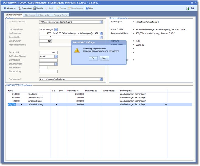 1. Öffnen Sie den Buchungsbereich über das Hauptmenü „Finanzbuchhaltung > Stapelbuchungen". Das Programm öffnet zunächst die Stapelauswahl mit der Karteikarte "Buchungen". 2. Aktivieren Sie hier die Karteikarte "Schablonen" und drücken Sie [F3], um einen neuen Stapel zu erfassen. 3. Legen Sie eine BEZEICHNUNG für den Stapel fest und speichern Sie Ihre Eingaben mit [F10]. 4. Starten Sie den Stapel mit [RETURN] und erfassen Sie die Buchung als normale Aufteilungsbuchung. 5. Nach kompletter Aufteilung bestätigen Sie die nachfolgende Abfrage nach der Verbuchung mit <ja>. 6. Nach der Verbuchung legen Sie eine Bezeichnung für die soeben erstellte Buchungsschablone fest und speichern Sie diese Eingabe mit [F10].