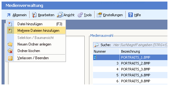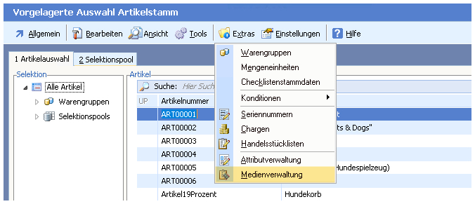 Öffnen Sie die Artikelstammdaten und starten Sie im Menü „Extras“ die „Medienverwaltung“.