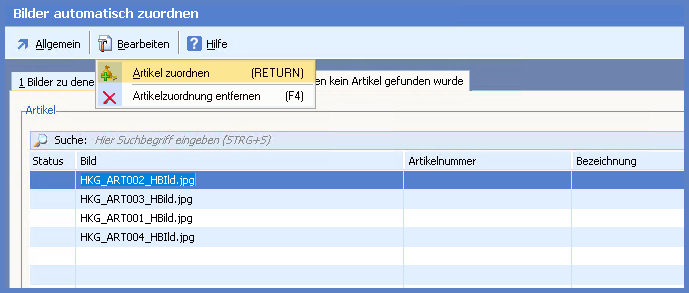 Wenn sehr viele Bilder den Artikeln zugeordnet werden müssen, kann eine automatische Zuordnung erfolgen. Voraussetzung dafür ist eine Abhängigkeit zwischen Datei und Artikel.