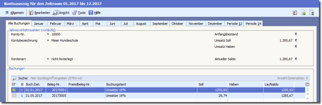 Öffnen sie den Kontoauszug durch Doppelklick mit der Maus, Drücken der Taste "ENTER" oder das Menü "Bearbeiten".