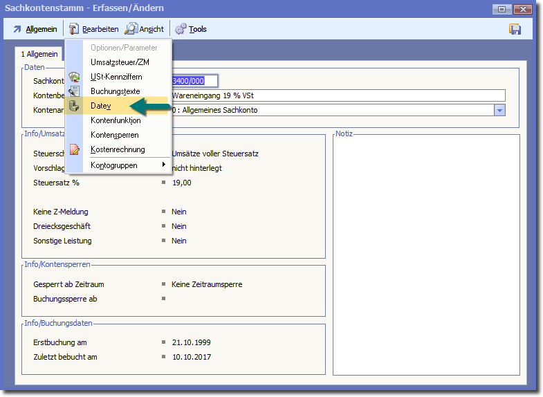 Öffnen Sie die Stammdaten des Sachkontos wechseln über das Menü "Bearbeiten" zu den Einstellungen "DATEV".