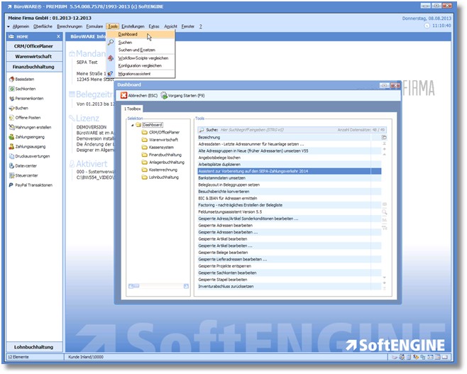 Dieser Assistent unterstützt sie bei der Umsetzung auf den SEPA-Zahlungsverkehr und ist über das Dashboard aufzurufen.