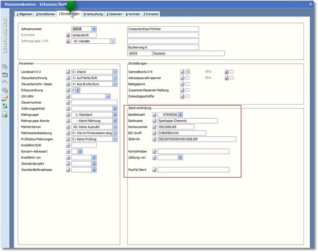In diesen Personenkonten muss ebenfalls eine korrekte Bankverbindung mit BIC- und IBAN-Nummer vorhanden sein.