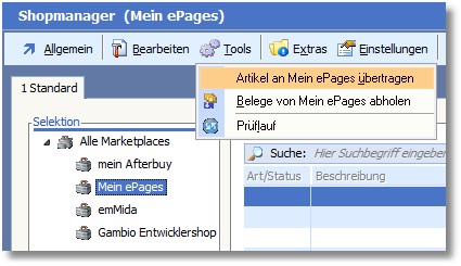 1. Markieren Sie im Shopmanager den gewünschten Marketplace und klicken Sie auf den Menüpunkt "Tools > Artikeldaten an (Marketplacename) übertragen".