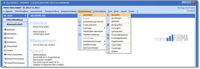 1. Klicken Sie mit der Maus im Hauptmenü auf "Kostenrechnung > Stammdaten > Basisdaten".