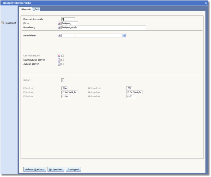 Diese Karteikarte nimmt die allgemeinen Daten zum Kostenstellenbereich auf.